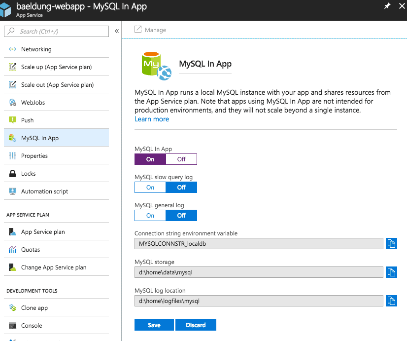 For the sake of simplicity, we’ll use its In-App MySQL as our data source, as its configuration is quite similar to other Azure database services.